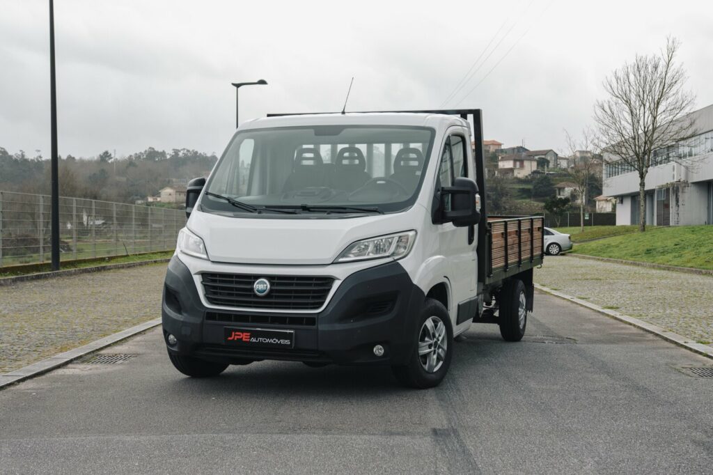 Fiat Ducato 2017 em branco — um ícone do segmento de furgões que se apresenta com uma imagem limpa e profissional. A cor branca confere-lhe uma presença sóbria e versátil, perfeita tanto para utilização profissional como para quem procura um veículo prático e sem complicações.